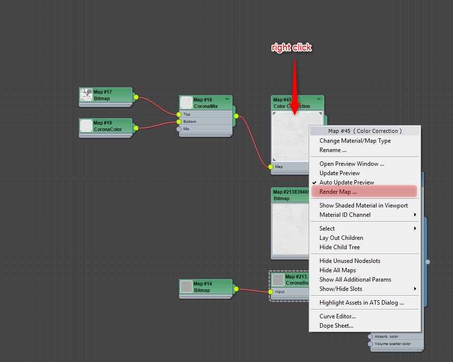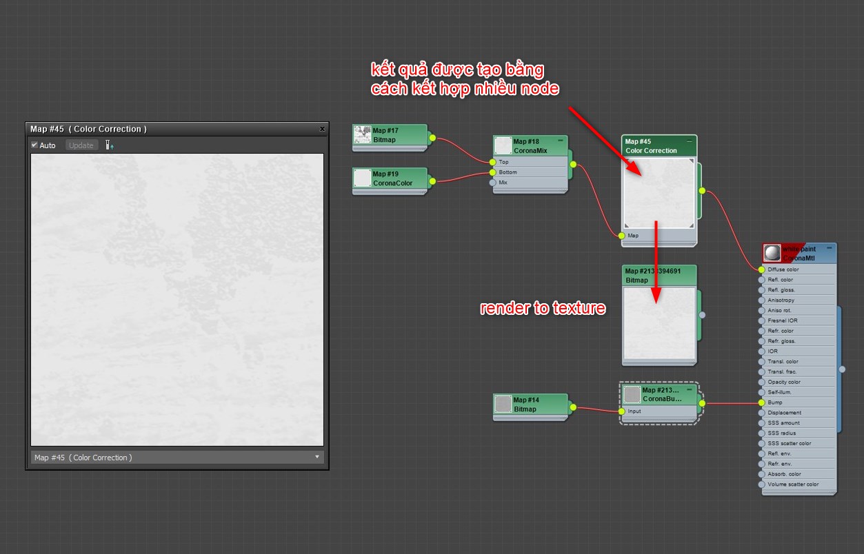 – RENDER MAP: chức năng giúp render ra kết quả sau khi kết hợp các map (xem ảnh). Sau khi render ra ta kéo thả trực tiếp vào node vật liệu chính, thế là ta đã có thể bỏ đi các node phía trước. Ta có thể chọn độ phân giải của map render.
